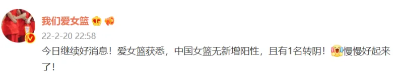 我們愛女籃在微博中寫道:“今日繼續好訊息!愛女籃獲悉,中國女籃無新增陽性,且有1名轉陰!慢慢好起來了!”