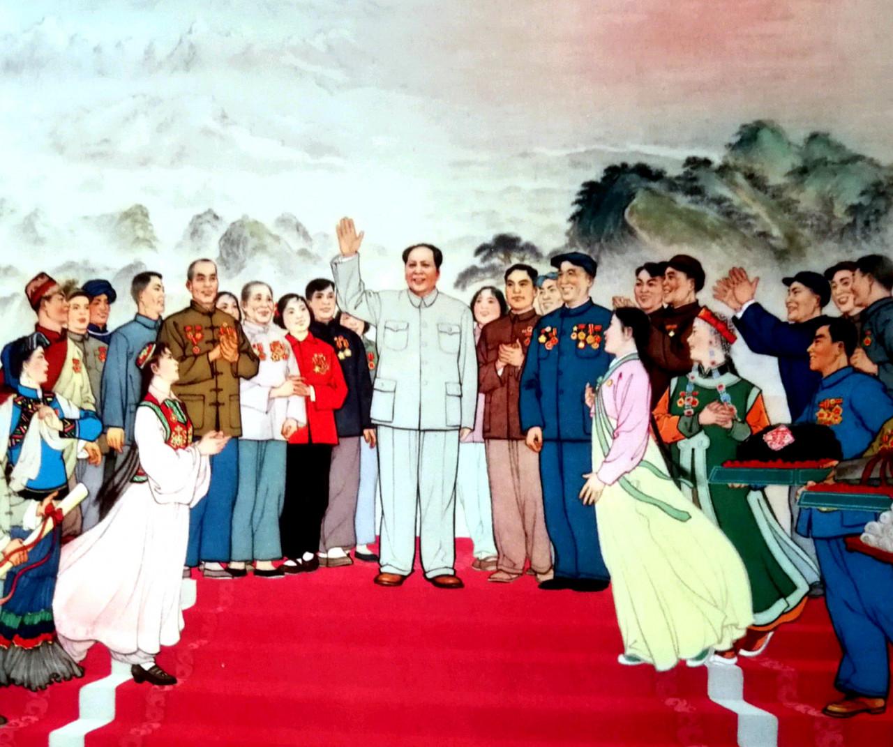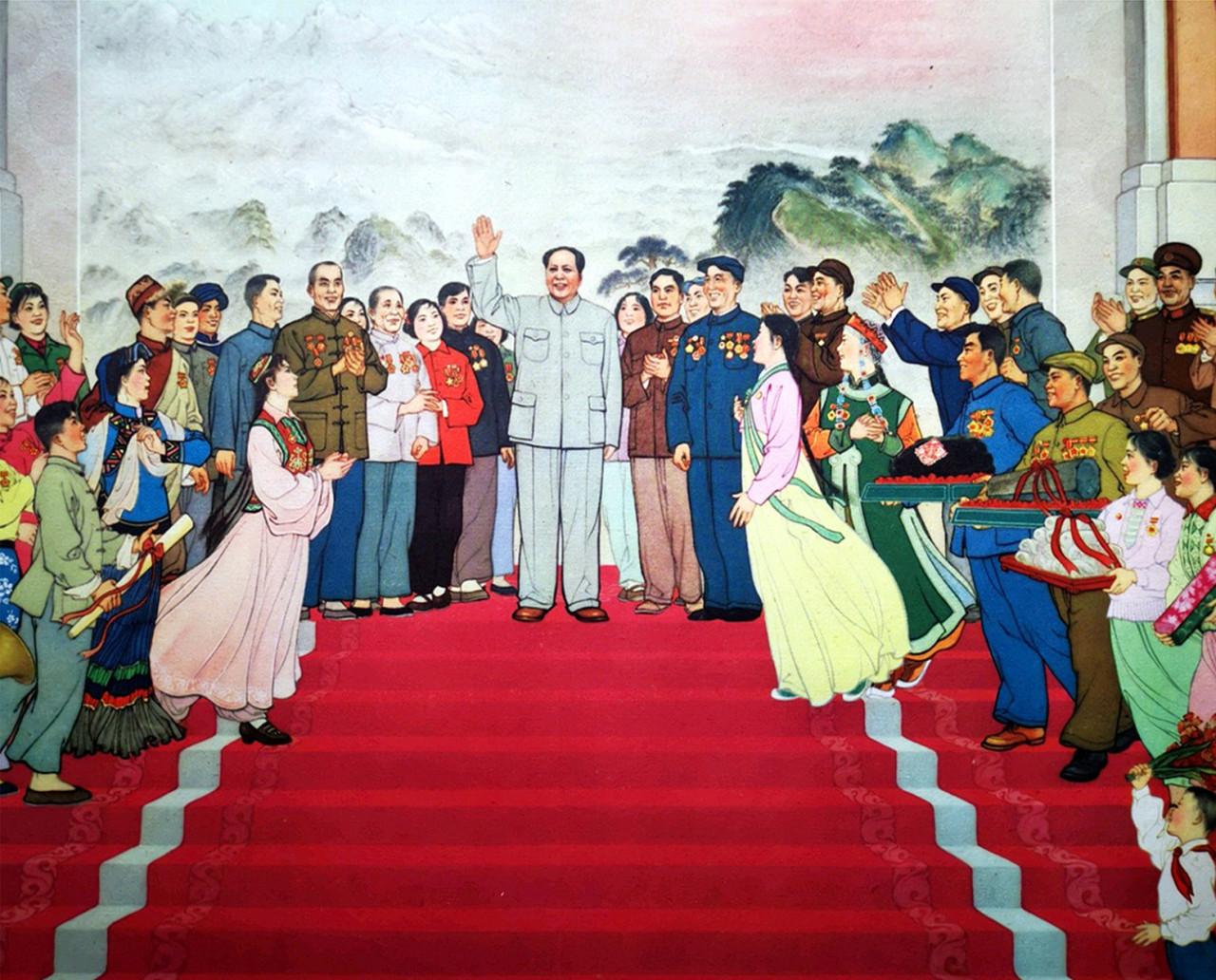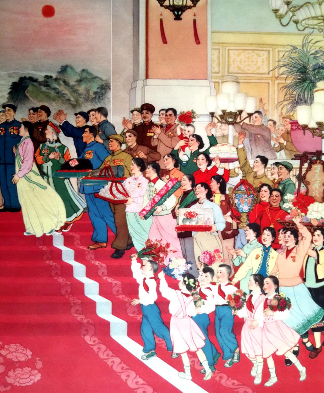 年畫《群英獻禮圖》,作者:江南春。1961年12月上海人民美術出社出版,定價:0.18元。畫中描繪了毛主席在人民大會堂接見各族人民代表,各族各業代表向毛主獻禮,場面溫馨、宏大、熱烈,人物眾多,喜慶歡快,色彩豔麗。映襯出新中國在毛主席領導下,民族團結、各行各業大力發展,突飛猛進,生機勃勃,一幅波瀾壯闊的史詩性的巨幅畫作。@東方紅裡83號
