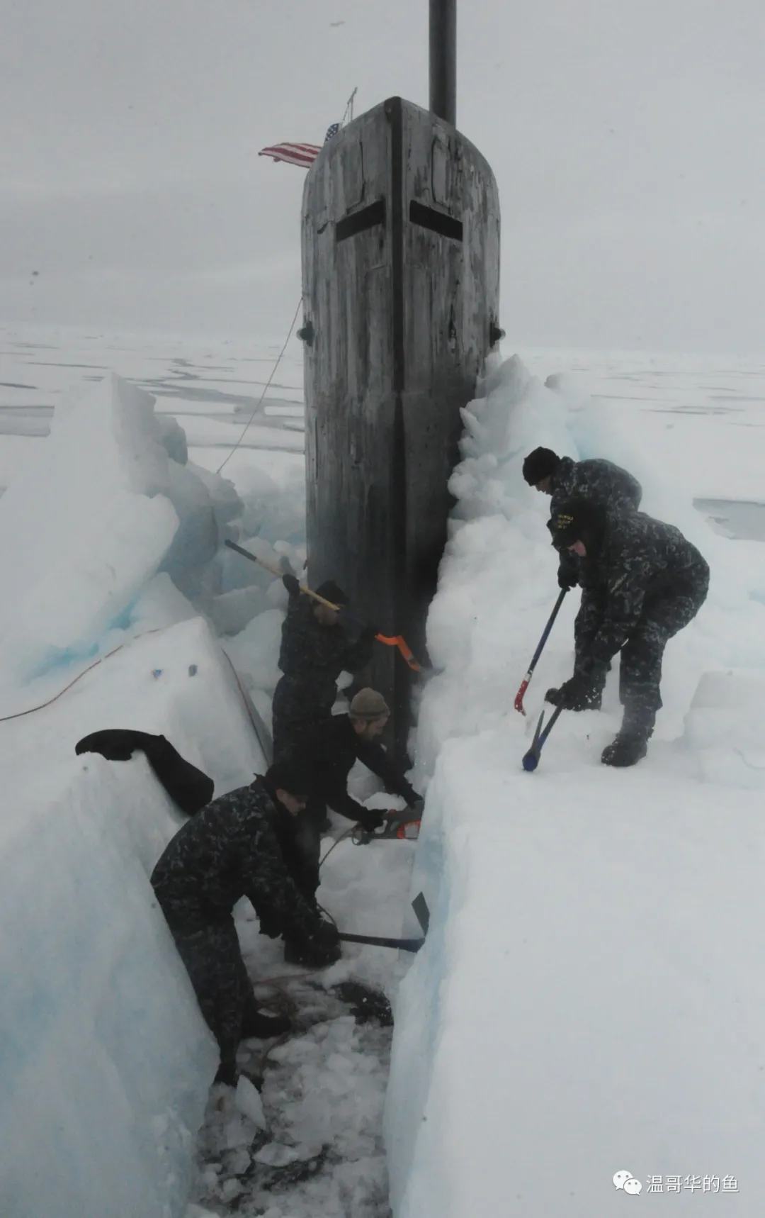 美國核潛艇的圍殼後緣一直保持垂直而沒有作流線型處理,也是為了提供更強的破冰能力,下圖是2015年在北冰洋上浮的“海狼”號。