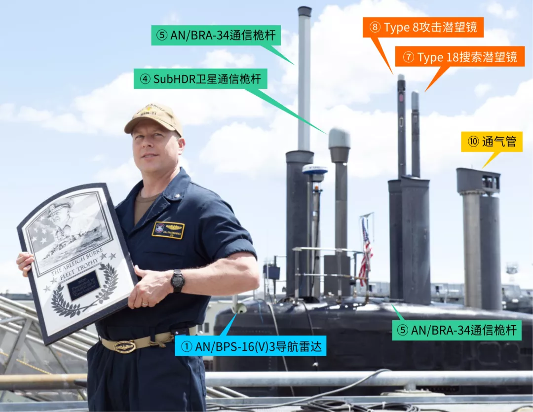 再來複習一下,下圖是2021年6月9日“海狼”號艇長傑夫·哈斯班德中校在布雷默頓基地領取2020年度阿利·伯克艦隊獎盃時的情景,背後的“海狼”號圍殼上從左到右依次能看到前部AN/BRA-34通訊桅杆、臨時燈桅、“蘑菇頭”SubHDR衛通桅杆、2具潛望鏡和通氣管。