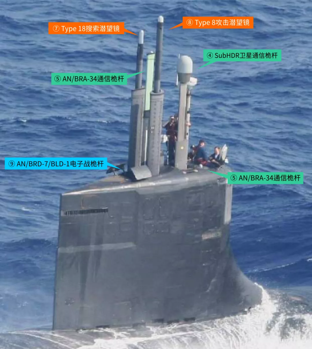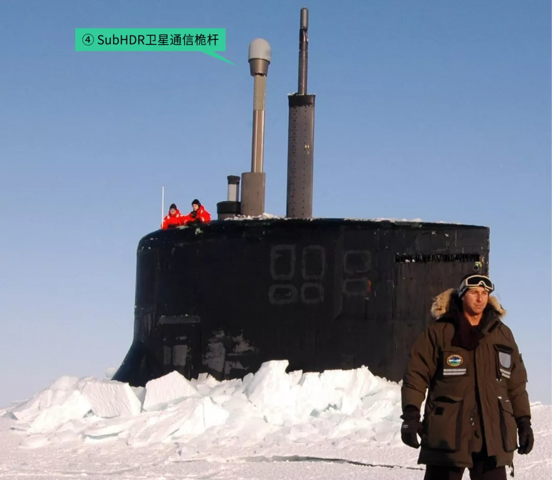④ SubHDR衛星通訊桅杆,在瞭望哨右後側,雷錫昂公司於1999年開始低速率生產,特徵是頂上有個半圓形的天線罩。透過這根高速率寬頻衛通天線可以令全球部署的核潛艇與水面戰鬥群、聯合特遣部隊、戰區司令部保持聯絡,傳輸加密的語音、資料、影象和影片資訊。這也是“俄亥俄”級、“洛杉磯”級和“弗吉尼亞”級的標配,不過“弗吉尼亞”級安裝了2具,增強了衛星通訊能力。