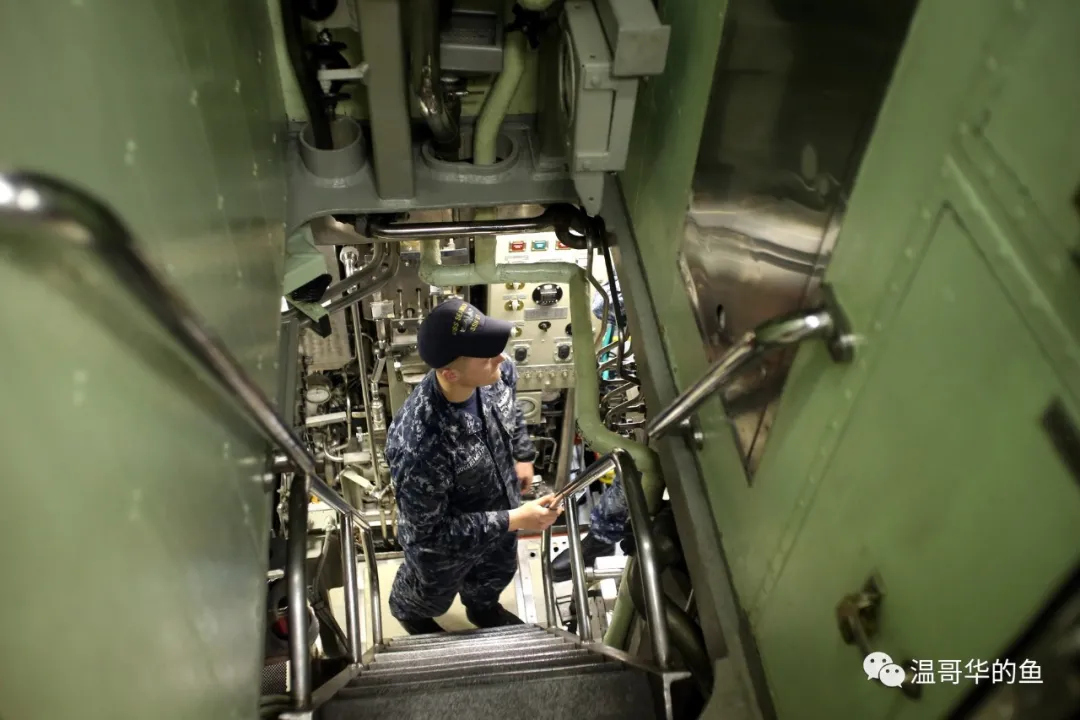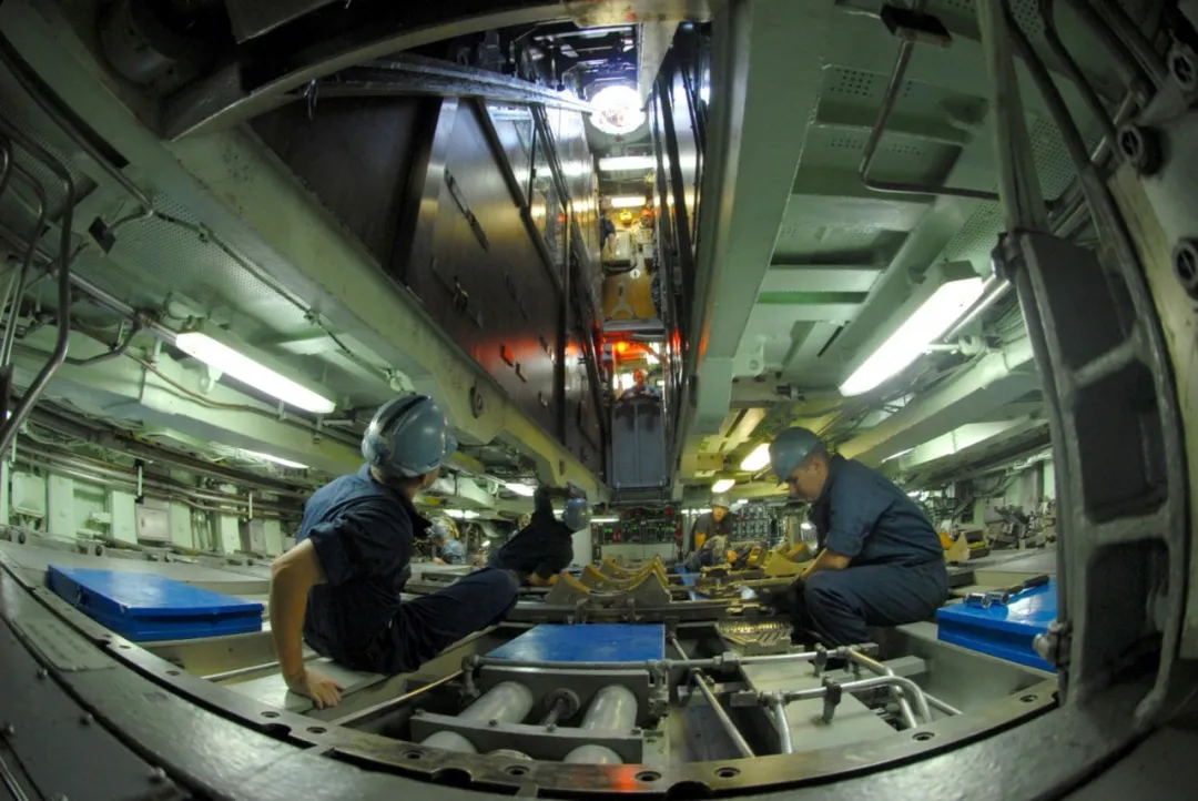 美式核潛艇的魚雷裝填方式和中俄不同,雙殼體的俄式和中式潛艇儲備浮力大,在港口輕載時艇體浮出水面的高度很高,可以直接從魚雷發射口裝填。而美式潛艇為單殼體儲備浮力小,魚雷發射口一直位於水下,所以魚雷和導彈要從艇體頂部的出入口頭朝上裝入,再透過內部通道轉移到魚雷艙。