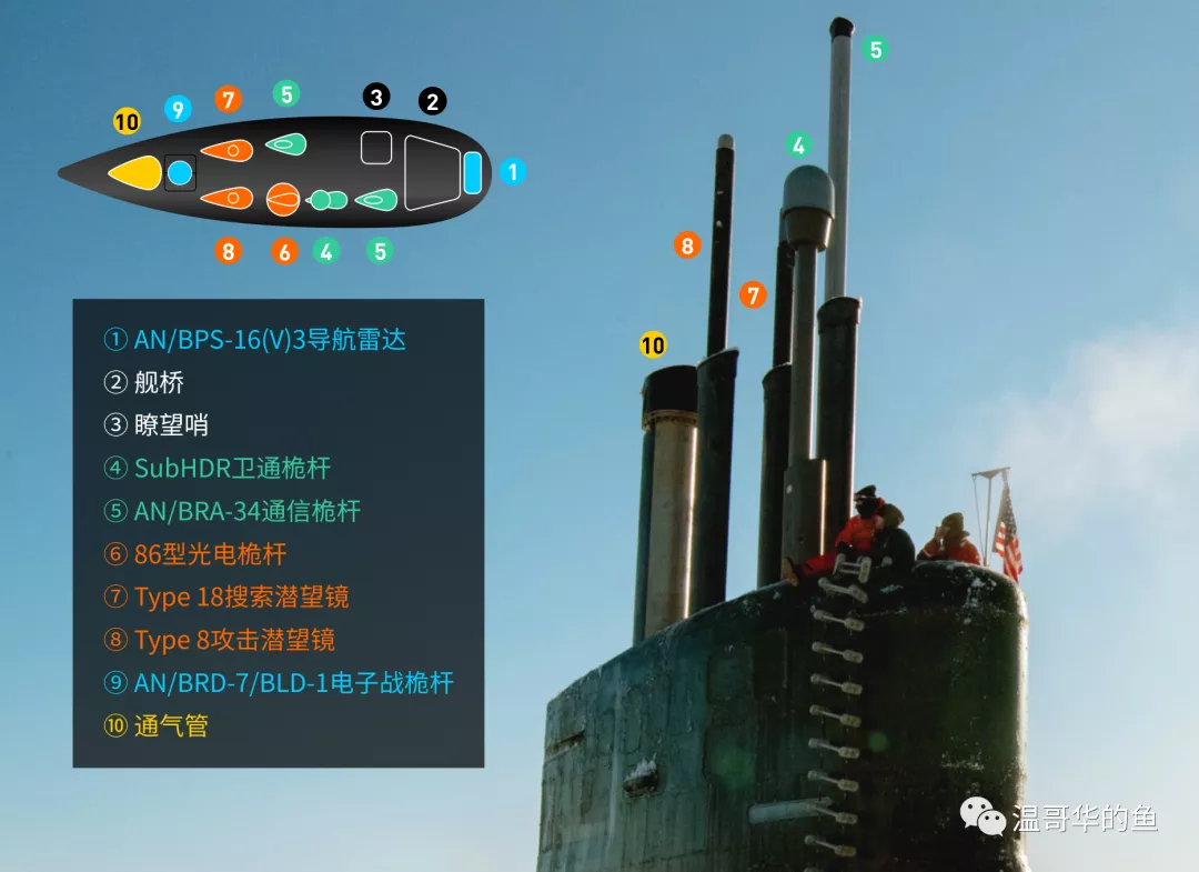 和寬大的俄式圍殼相比,美式圍殼尺寸非常緊湊,圍殼頂部被潛望鏡等各種升降裝置塞得滿滿的。每型潛艇的配置都不同,我一直沒搞清楚過,這次專門花了大半個晚上把“海狼”級的各個桅杆盤點了一番。