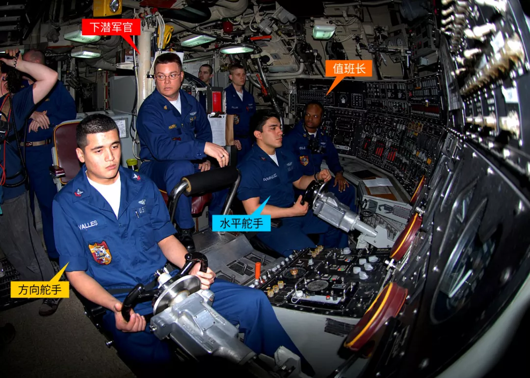 在兩位舵手身後坐著的是下潛軍官(Diving Officer),簡稱Dive,監控前三者的每一個動作。