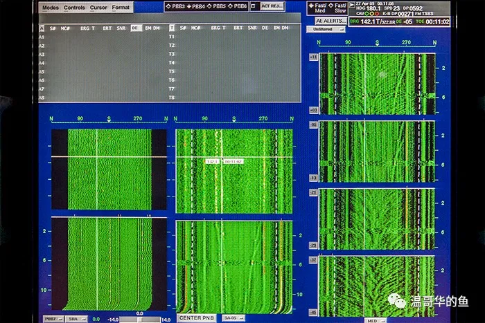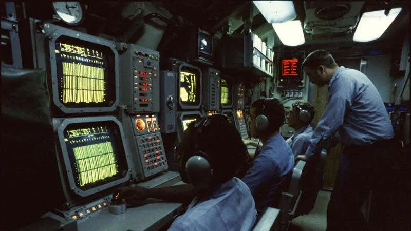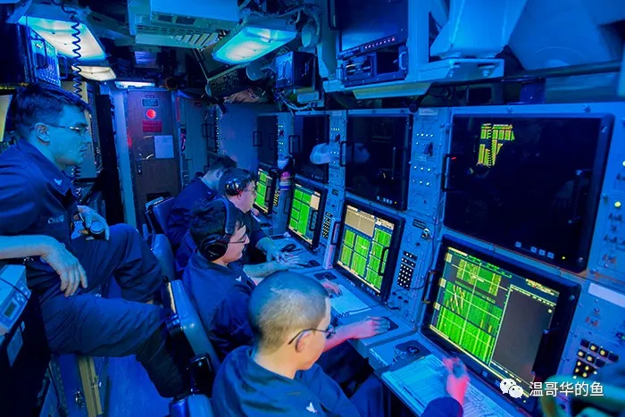 指揮艙的後面是單獨的一間聲吶室,至少7名聲吶員(Sonarman)日夜監控水面和水下的聲音訊號。聲吶員在出海前都已經在岸上基地進行了為期一年的專業訓練並獲得認證,他們更多時候是在看而不是聽,將現代科技與個人敏銳的聽覺、視覺相結合,識別出聲紋中的細微變化。