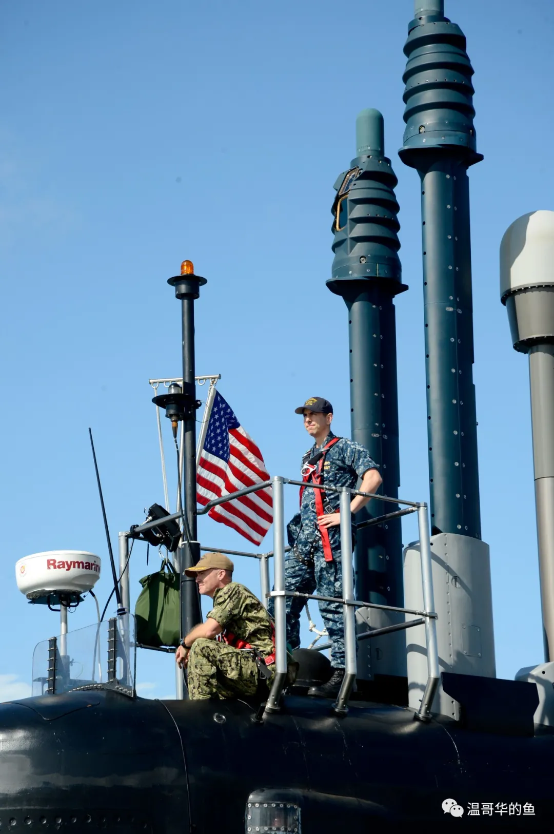 ⑤ AN/BRA-34通訊桅杆,在瞭望哨正後方,杆體上半截通常刷成淺綠色,直徑比潛望鏡還粗,內部集成了VLF/LF、MF/HF、UHF(225-400MHz)、UHF(240-315MHz)4個頻段的資料/語音傳輸模組和IFF敵我識別、GPS全球衛星定位兩個附加模組,覆蓋從甚低頻到特高頻的無線電通訊頻率。