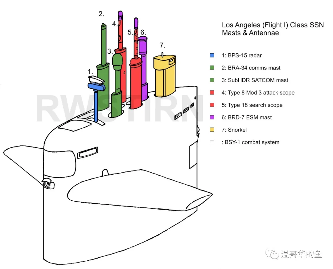 ⑨ AN/BRD-7電子戰桅杆,在兩具潛望鏡之後,和“洛杉磯”級相同,主要用於雷達、通訊訊號的蒐集與測向。同樣網路上找不到任何“海狼”級升起BRD-7桅杆的圖片,只是在“洛杉磯”級圍殼的線圖上看到BRD-7桅杆(下圖⑥)的樣子,頂部是一個卵形的護蓋。