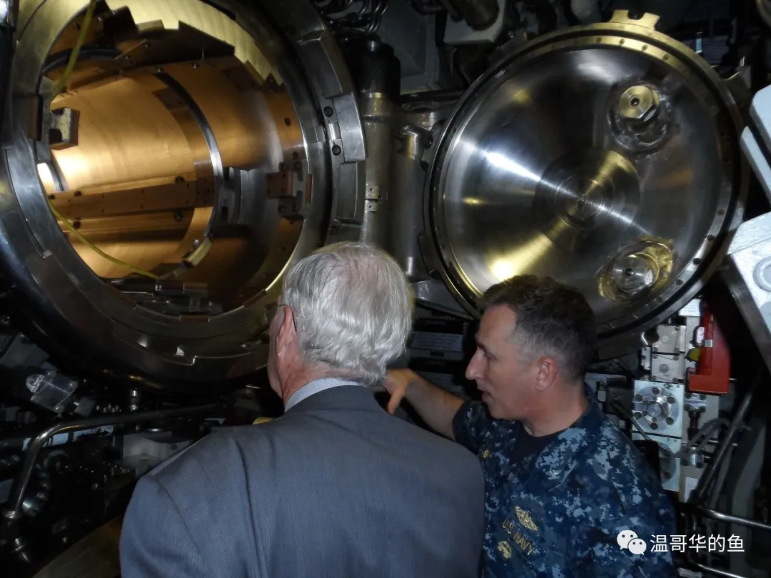 > 2013年9月11日,“海狼”號訪問挪威哈肯斯沃恩海軍基地,美國駐挪威大使登艇參觀,圖中可以看到雙層的魚雷艙結構