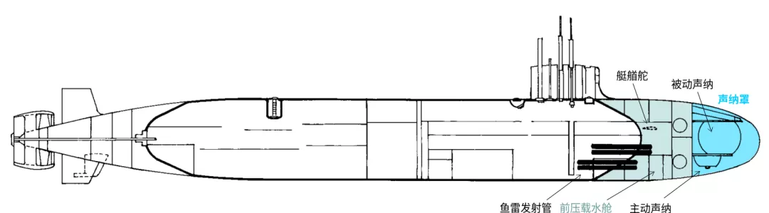 佔艇長1/6的艇艏段都是非耐壓的,也就是說內部是充滿海水的。從前到後依次是聲吶艙、聲吶隔壁和前壓載水艙。