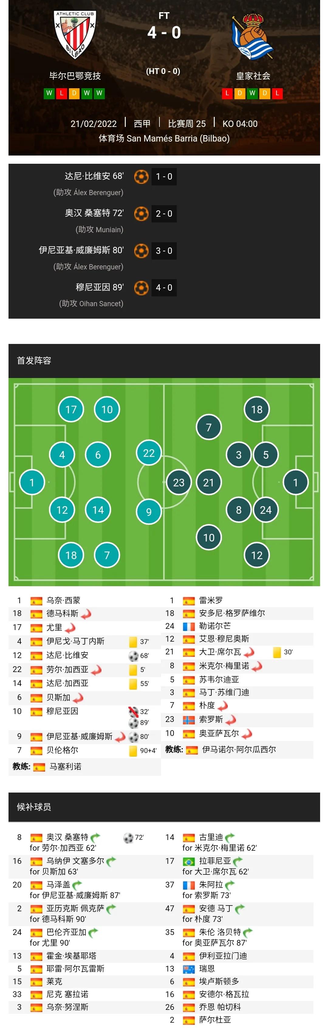 北京時間2月21日凌晨,西班牙足球甲級聯賽第25輪比賽迎來巴斯克德比戰,綽號“巴斯克雄獅”的畢爾巴鄂競技隊在聖馬梅斯球場迎戰皇家馬德里隊。只用巴斯克球員的畢爾巴鄂競技隊上輪在客場被馬洛卡隊擊敗,本場比賽一開始就瘋狂拼搶,這讓對手皇家社會隊球員們像踩不上油的車子。第30分鐘畢爾巴鄂競技隊的前鋒威廉姆斯射門擊中皇家社會隊的席爾瓦手中,主隊獲得點球機會,但前鋒穆尼亞因主罰的點球卻被皇家社會隊門將雷米羅撲出,使得整個聖馬梅斯球場陷入沉默。第62分鐘畢爾巴鄂競技隊換上身材高大的中場桑塞特成為比賽的轉折點。第68分鐘後衛達尼.比維安頭球破門為畢爾巴鄂競技隊取得領先。第72分鐘穆尼亞因助攻桑塞特,後者在禁區內起腳勁射破門將比分改寫為二比零。第80分鐘畢爾巴鄂競技隊打出漂亮反擊,右邊鋒貝倫格爾送出本場比賽第二粒助攻,前鋒威廉姆斯破門主隊三球領。第89分鐘桑塞特投桃報李助攻前鋒穆尼亞因,後者將球打進將比分最終鎖定為四比零。