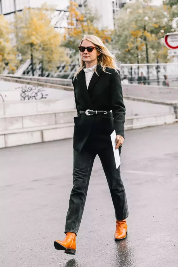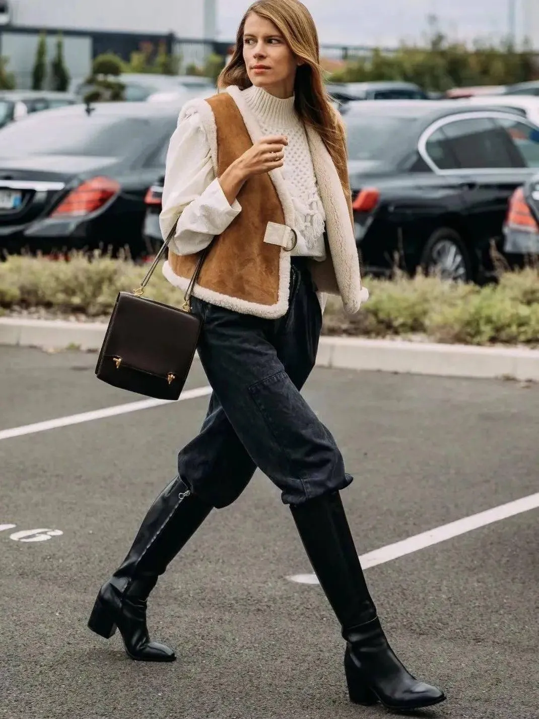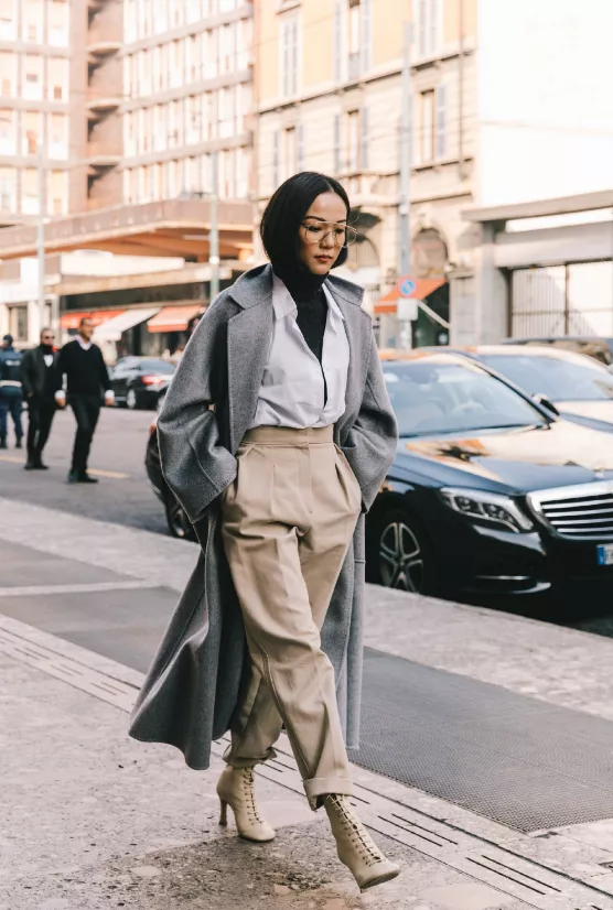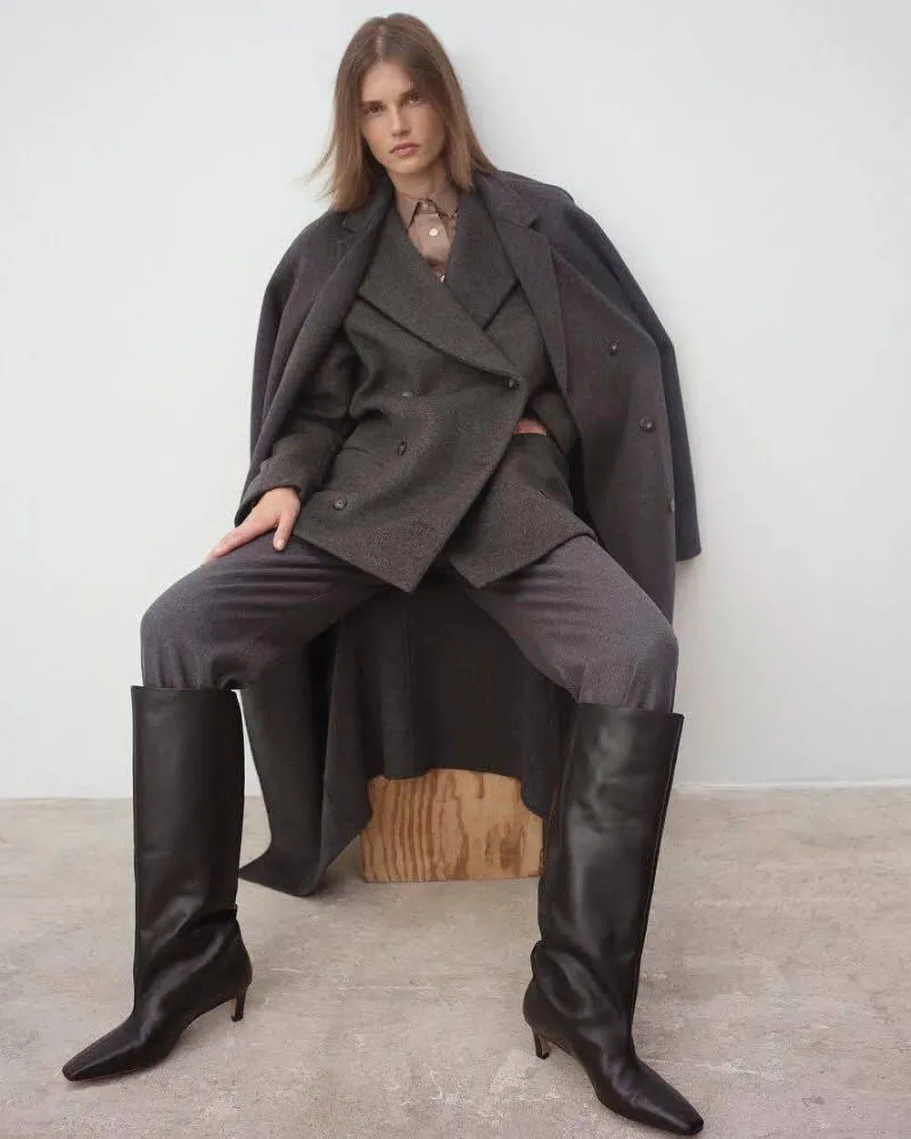 選擇寬鬆款式的錐形褲,西裝褲,搭配長靴,看起來則偏向於說一不二的“大女人風”。