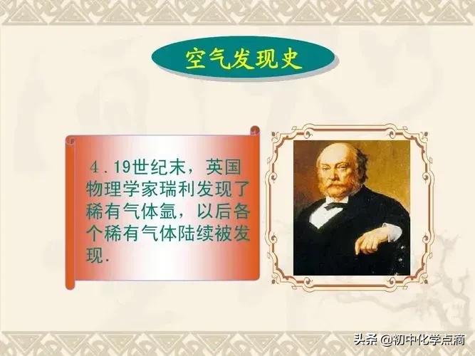 空氣中存在稀有氣體這一發現是由英國科學家瑞利和拉姆齊共同完成的。在此之前,人們普遍認為空氣中除了少量的水蒸氣和二氧化碳之外,其餘的就是氧氣和氮氣了。1892年,物理學家瑞利利用靈敏度達0.0001g的天平,在經過長達10年的氣體密度測量工作之後,發現從空氣中分離得到的氮氣密度(1.2572 g / L )與分解含氮物質得到的氮氣密度(1.2508 g / L )之間總是有微小的差異。瑞利沒有放過這一微小的差異,他與化學家拉姆齊合作,先是仔細去除空氣中的氧氣、二氧化碳、水蒸氣和氮氣,然後利用分光鏡觀察剩餘氣體的光譜線,終於發現在空氣中還存在著氬氣。在以後的幾年裡,拉姆齊又透過分離液態空氣和光譜法陸續發現了氪、氖、氨、氙。