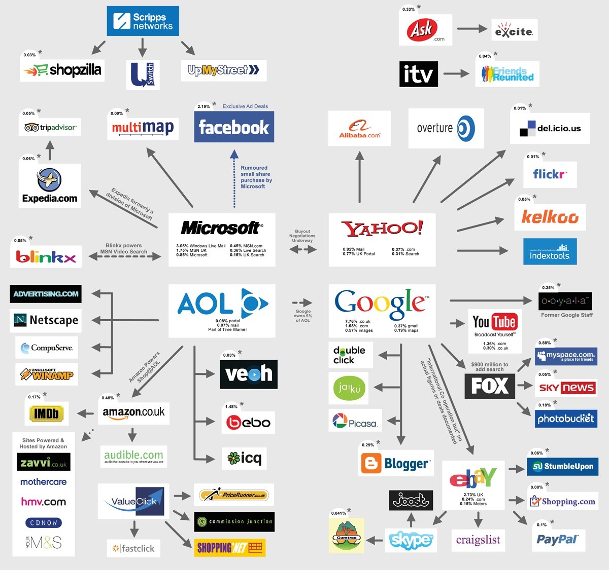 控制大部分網際網路的 4 家公司:谷歌、美國線上、微軟和雅虎。