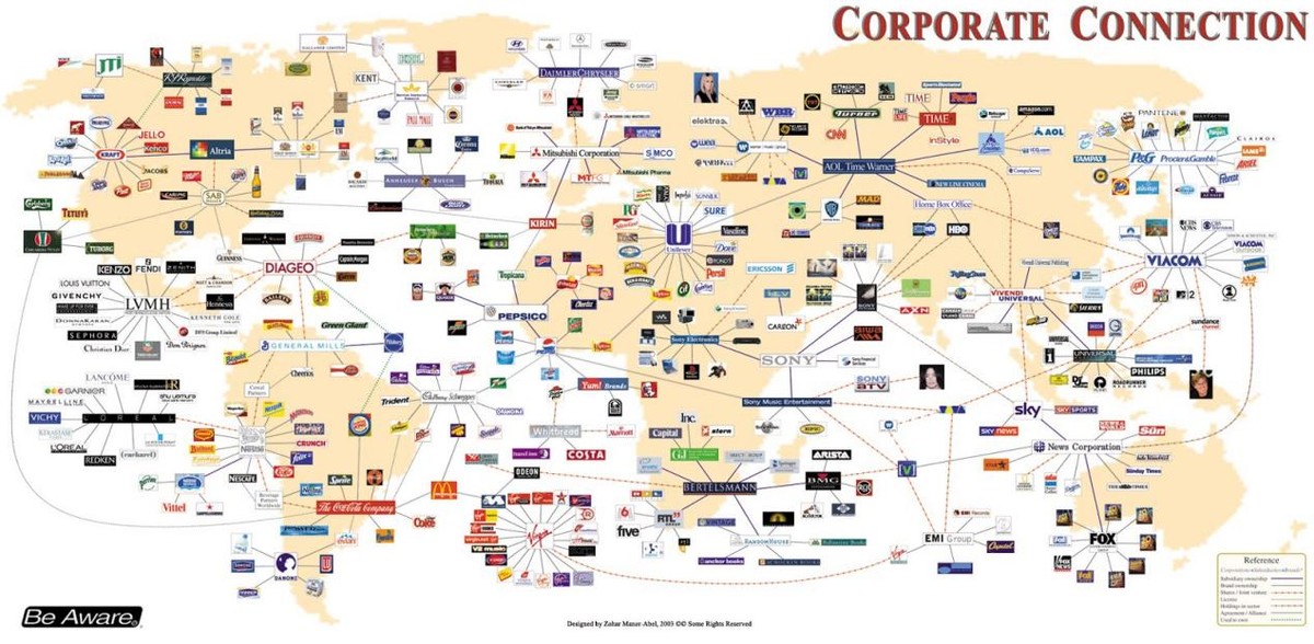 瑞士宣傳研究中心 (SPR) 的研究小組成功地將所有主要媒體公司與一個單一的組織聯絡起來,即對外關係委員會 (CFR)。在過去的4年裡,主流媒體已經從幾十家競爭公司合併到只有六家。數百個頻道、網站、通訊社、報紙和雜誌,佔所有媒體的90%,都被極少數人控制,讓愚蠢的大眾產生了選擇的錯覺。只有六家公司控制了西方世界與媒體相關的幾乎所有消費。