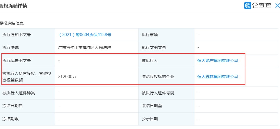 企查查顯示,近日,恆大地產持有的恆大園林集團有限公司21.2億元股權被凍結,對應持股比例為100%,執行法院為廣東省佛山市禪城區人民法院。據悉,本次凍結是由於粵0604執保4158號的財產保全執行行動,該案件名稱為華潤深國投信託有限公司與佛山市禪城區恆盈展房地產開發有限公司,佛山順德區恆昶房地產開發有限公司,恆大地產集團有限公司執行案。此次凍結股權的標的企業為恆大園林集團有限公司,該公司的註冊資本為21.2億人民幣,由恆大地產集團有限公司持股100%,被凍結股權為21.2億元。