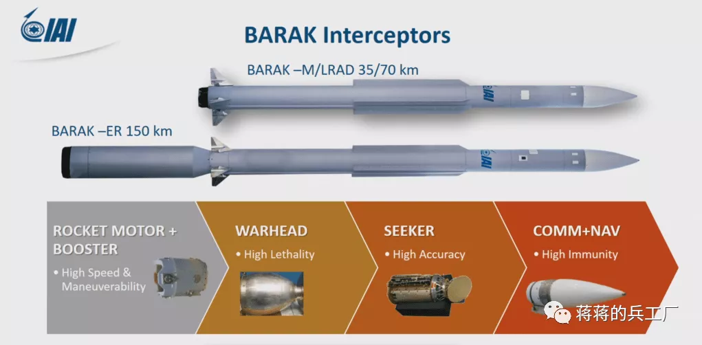 巴拉克ER防空導彈全長5.8米,其中攔截彈長4.8米,彈徑0.227米,助推器長1.3米,直徑0.35米,全重400千克,配備23千克破片殺傷戰鬥部和鐳射近炸引信,採用固體燃料雙推力火箭發動機推進,垂直髮射,可實施360°全向攔截,最大攔截高度30千米,攔截距離150千米,由GPS/INS制導+資料鏈+主動雷達末制導打擊目標,機動過載達50g,可全天候攔截各類有人/無人駕駛飛行器、巡航導彈以及滑翔制導炸彈。巴拉克MX的導彈發射車TEL基於卡車底盤運載,在發射架千斤頂架好後就可撤離,也可直接安裝在卡車上,有兩排8個發射箱,透過起豎發射。該型導彈採用高拋彈道攔截目標,導彈速度可能在2馬赫左右,比較慢,即使加上助推器也難以攔截彈道導彈類目標。