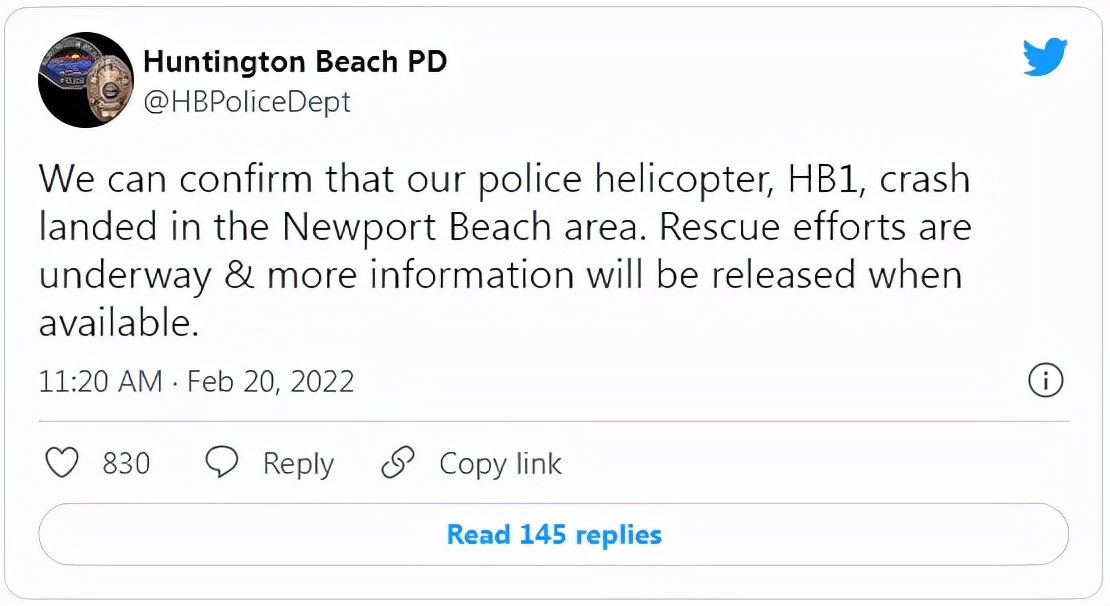 杭亭頓海灘警局稍早於推特發文證實,一架HB1警用直升機在新港灘墜毀,已經展開救援。