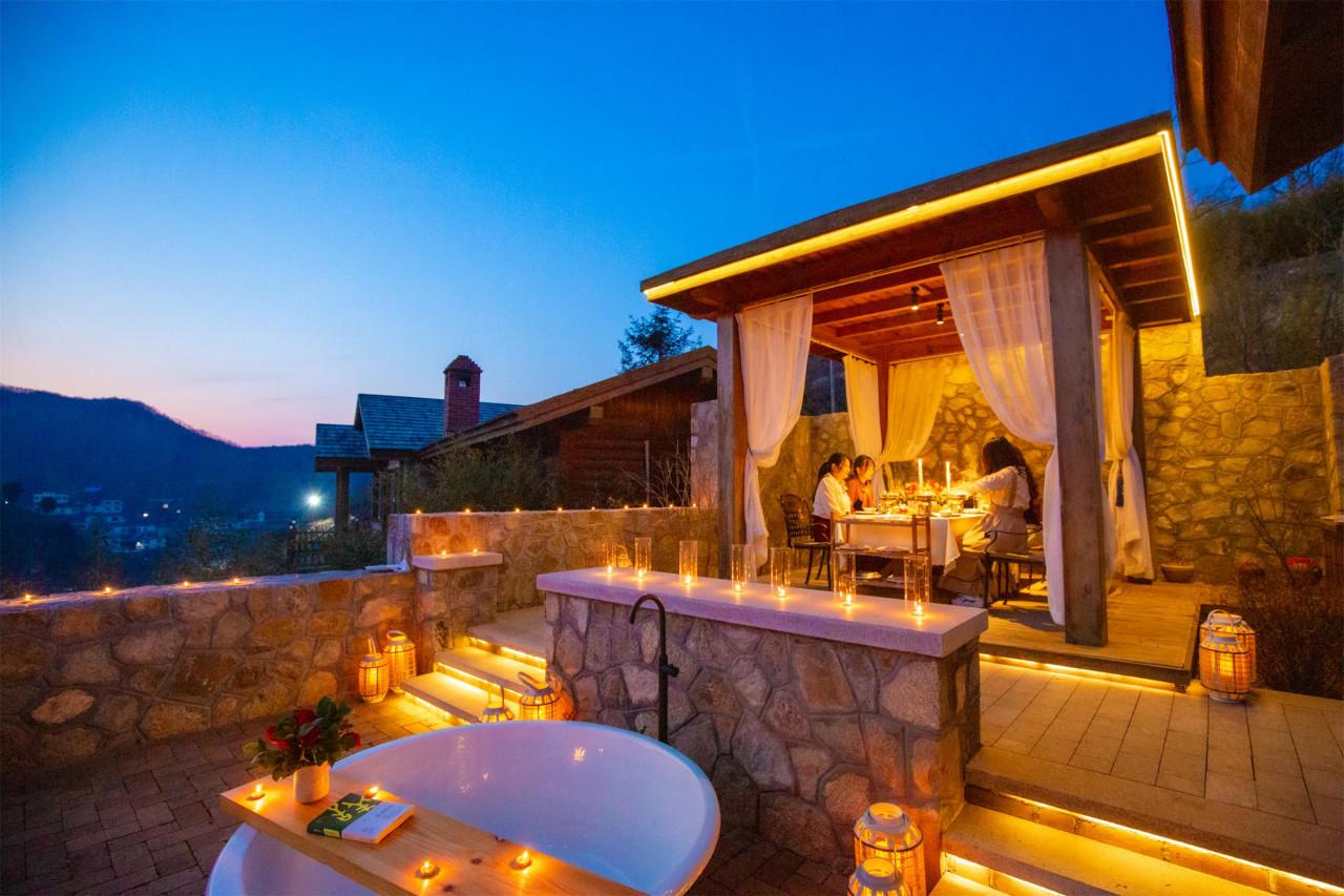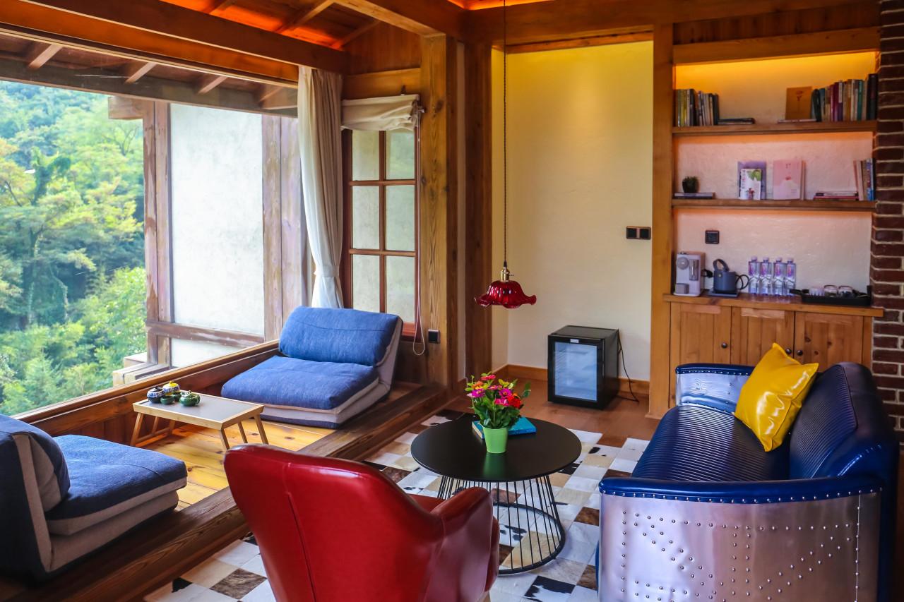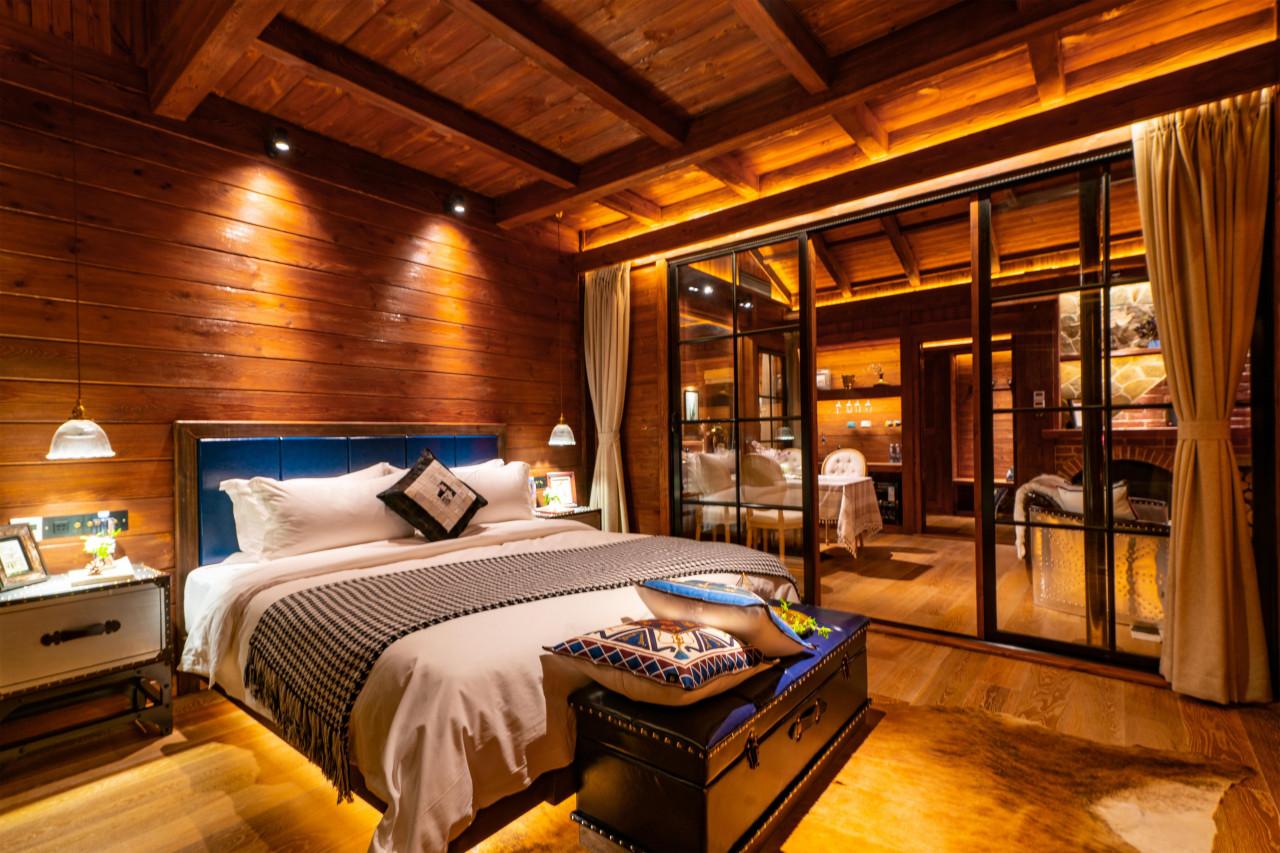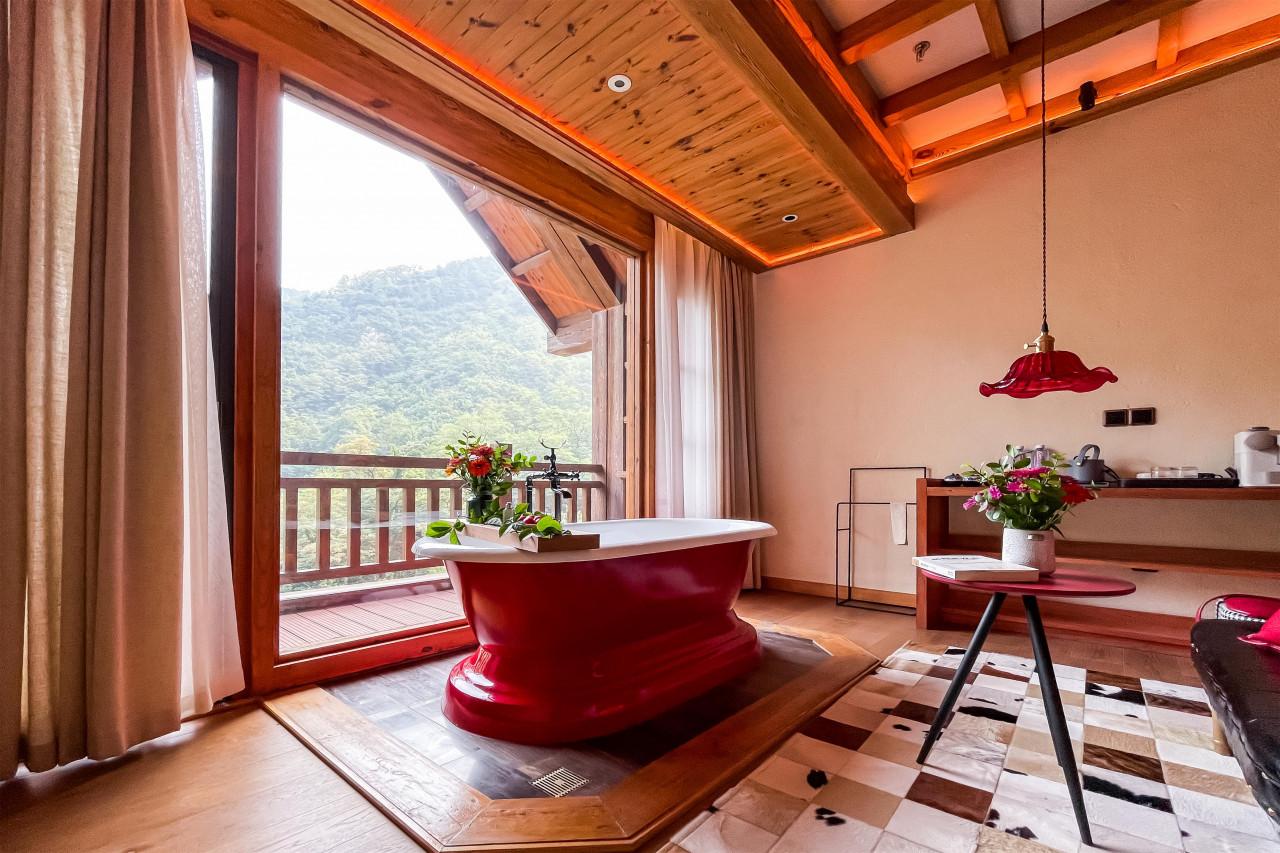 山景石木結構的野奢獨棟別墅-閱木山居:室內,2房2廳1榻帶閣樓、雙豪華衛生間、大浴缸、北歐壁爐加落地觀景大窗;室外,雙院落、雙露臺,戶外淋浴、星空泡池、趣味搖車、休閒涼亭……