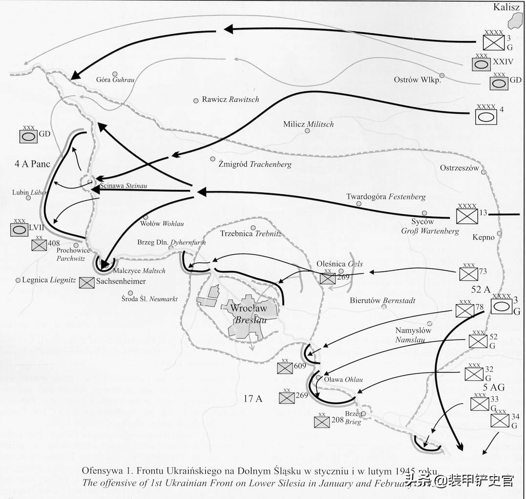 ■1945年1月蘇軍向西裡西亞發動攻勢的路線圖,可見佈雷斯勞以東奧爾斯的位置。