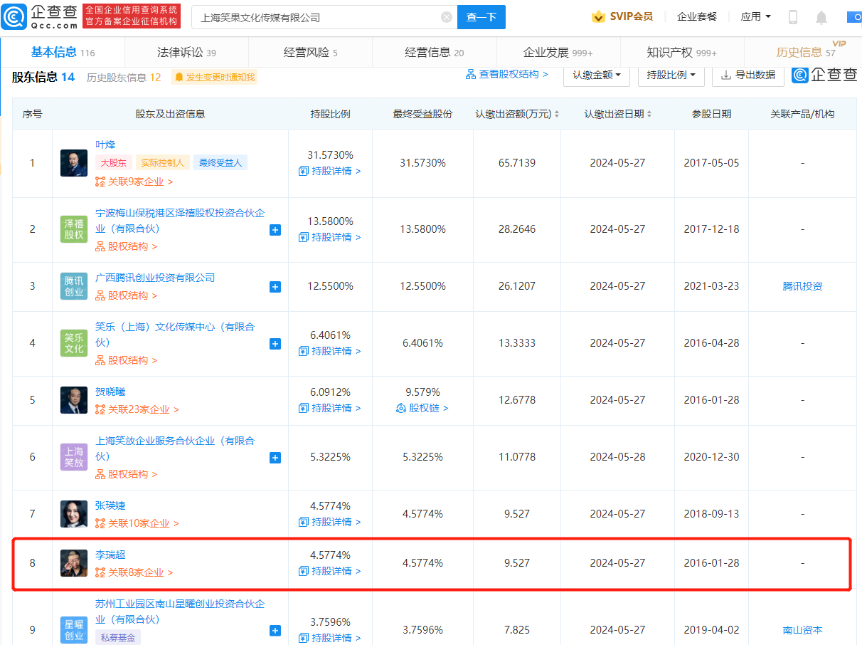 Tech星球2月21日訊息,近日,上海笑果文化傳媒有限公司發生工商變更,李瑞超(李誕)退出董事職務。企查查資訊顯示,笑果文化是一家喜劇脫口秀內容提供商,公司成立於2014年,法定代表人為葉烽,註冊資本208.13萬元人民幣。李誕目前仍為該公司股東,持股4.5774%。