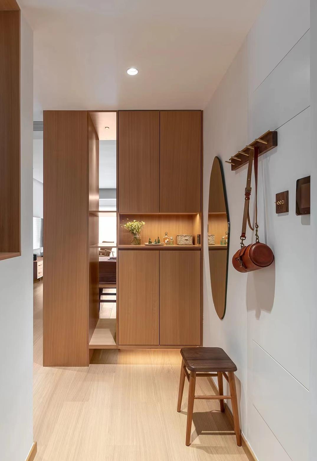 玄關櫃選擇的是隔斷式確保私密性,同時部分櫃體採用鏤空設計,引入客廳光線與空氣。不規則牆鏡配合原木金屬掛鉤,滿足進出門的生活需求,換鞋凳的選擇以不佔空間為主。