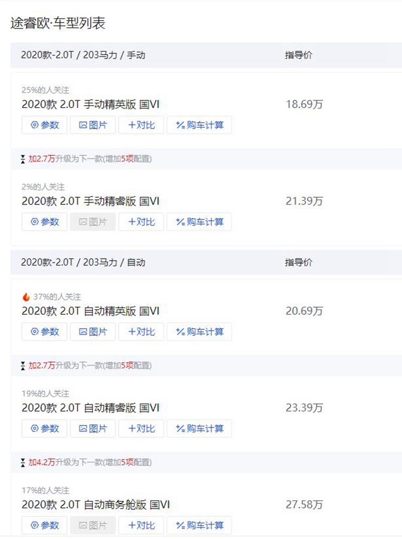 總結:上述車型是2020款 2.0T 自動精睿版 國VI,指導價是:23.39萬,該車屬於次頂配車型,各方面都比較均衡,價效比不錯。如果購車預算不足,對配置要求不高,可以看看入門級車型,2020款 2.0T 手動精英版 國VI,指導價是:18.69萬,手動擋開著有駕駛樂趣,配置也不低,有空氣懸掛、後駐車雷達、倒車影像、仿皮座椅,價效比也是不錯的。