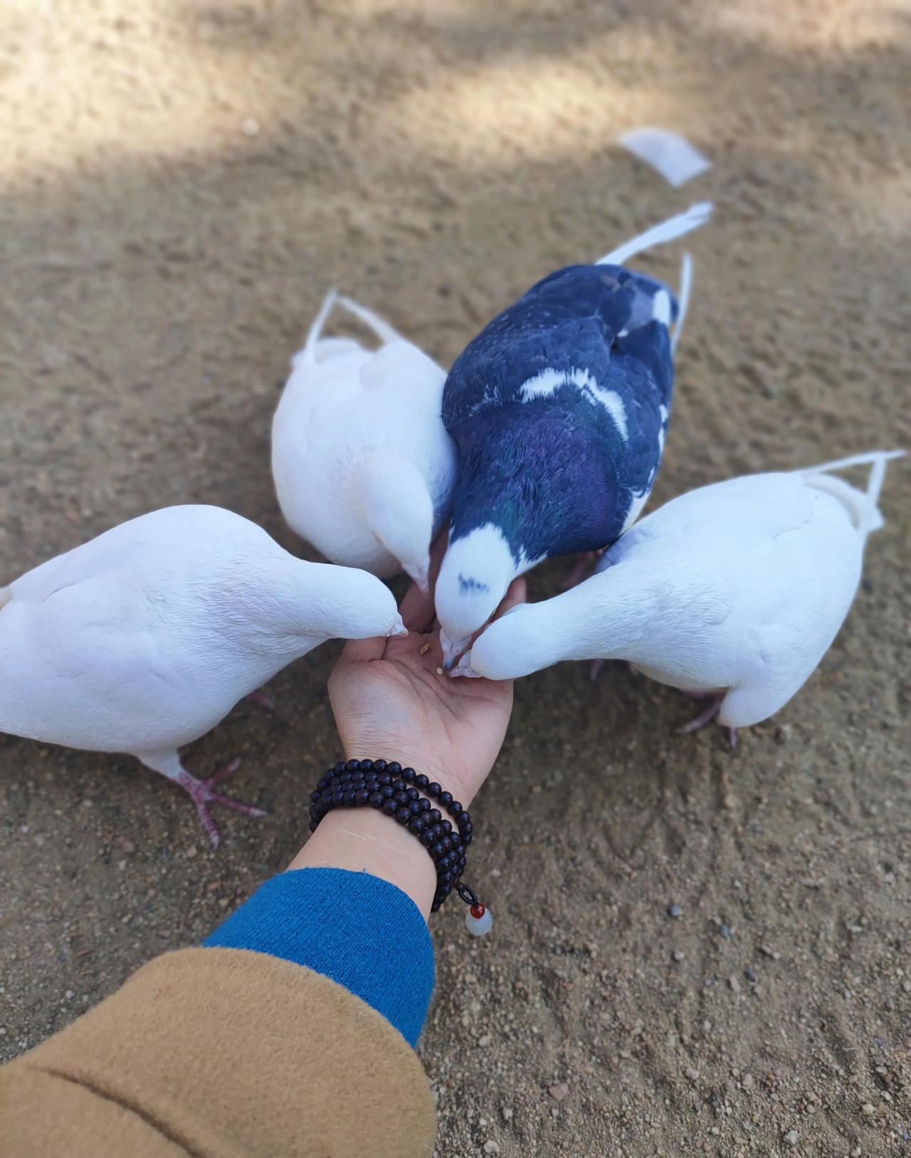 白鴿真的好聰明,看你手裡糧食少扭頭就走,一副見過世面不稀罕的姿態;我故意把糧食放在袋子裡不拿出來,在它眼前顛顛,它也能很快識別,不做停留,直接尋找下個目標。