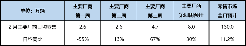 乘聯會綜合估算,2月零售將達到130.0萬輛,同比增長11.2%。其中,新能源市場預計保持三位數的同比正增長,滲透率將接近20%。
