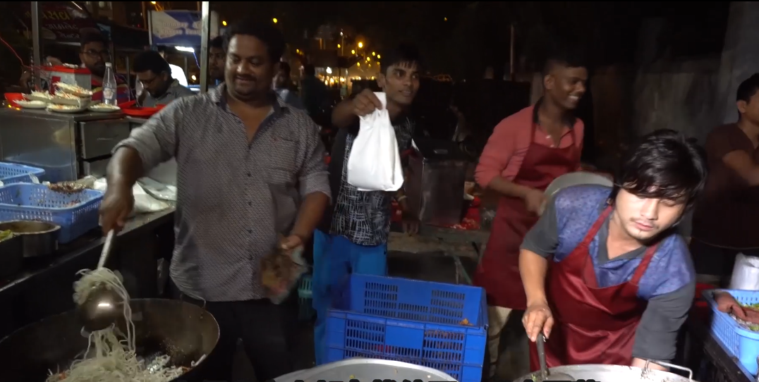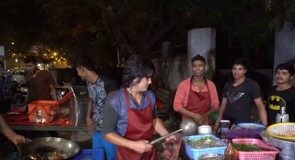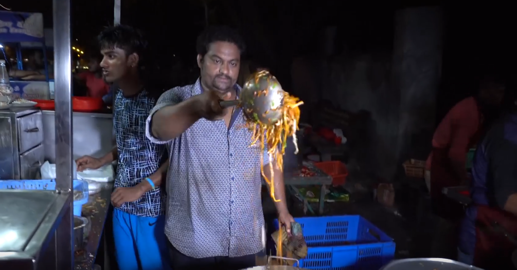 不過另外一個印度小哥做的菜,看起來就熟悉很多,如今的他正在翻炒一些蔬菜,包括一些洋蔥 一些生薑,一點大蒜以及一點的胡蘿蔔,在猛火之下,快速翻炒的蔬菜迸發奇妙的香氣,緊接著 再下入一些名叫滿洲球的東西最後才進入印度香米以及麵條,放上大量的醬油,這看著是不是有點熟悉的感覺,其實它就是模仿中國菜裡頭的幹炒牛河,只不過 這是印度的改良版,因為印度找不到河粉,也沒有許多配料,所以老闆自作主張的進行了改良,包括剛剛的油炸蔬菜,同樣也是印度改良版,模仿的就是中國的糖醋肉,材料同樣是使用印度本土的食材,這都代表著,雖然這印度小哥雖然號稱到中國學藝,但怎麼樣都沒有學到家,除了中式炒鍋,已經翻炒中式炒鍋喜歡敲打兩下,這幾乎和中國菜沒啥關聯,最讓人反感的是印度小哥做菜的時候特別喜歡在鍋邊敲打兩下勺子的習慣,頗有點作秀的感覺。