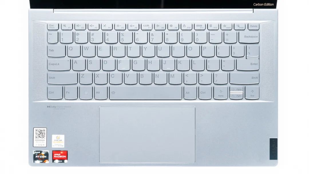 YOGA Pro14s Carbon 2022也是一樣,它採用了碳纖維外殼,表面有一層磨砂金屬噴漆,給我的體驗更像是做成金屬觀感的塑膠殼,就像早期三星手機那樣。