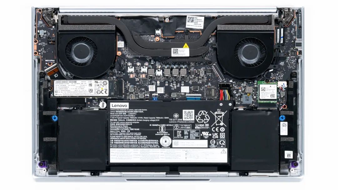 上圖是聯想 YOGA Pro14s Carbon 2022的拆機實拍圖,雙風扇雙熱管的組合。