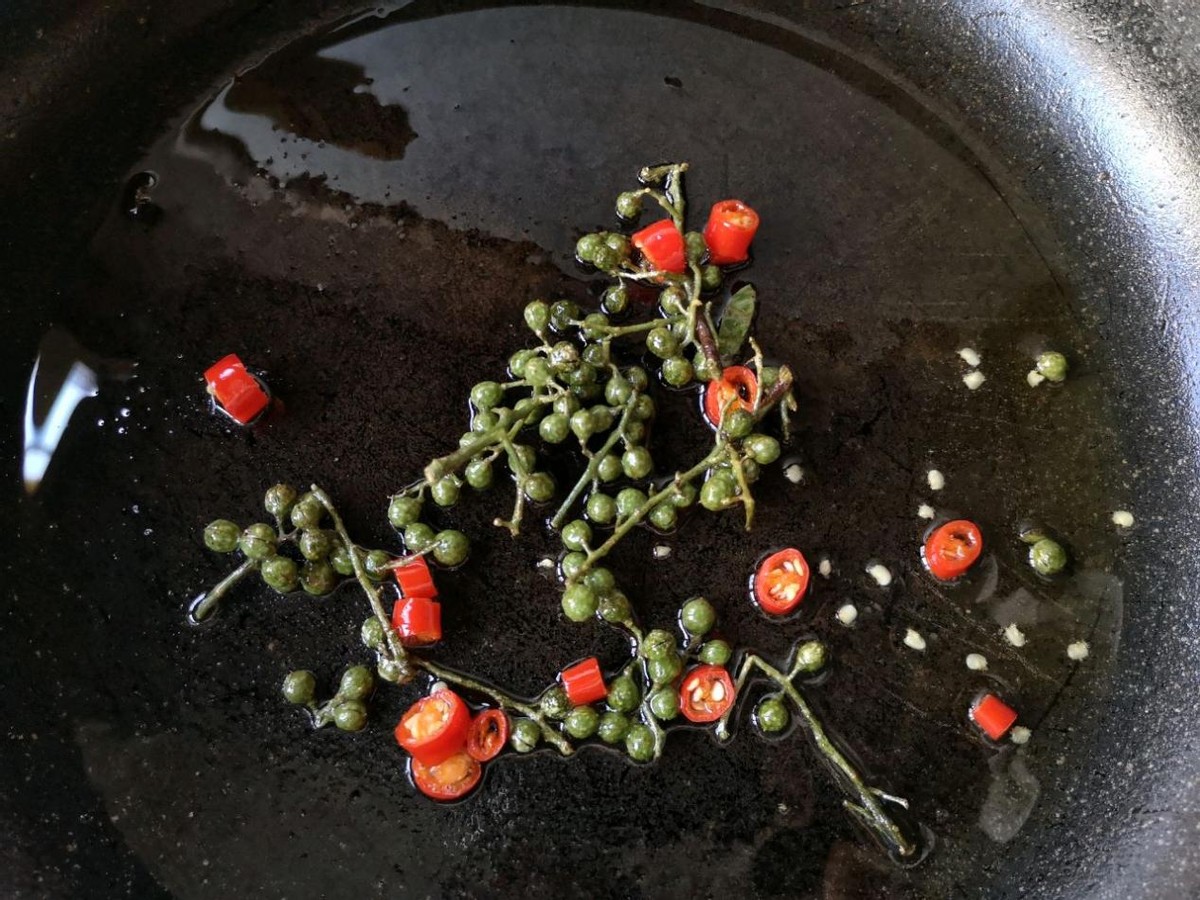 5、這道金湯藤椒魚片製作的全程都是用的藤椒油,這樣做出來的成品味道更香一些,最後用熱油炒一下藤椒和小米辣也可以讓這道金湯藤椒魚片的味道更加香濃一些!