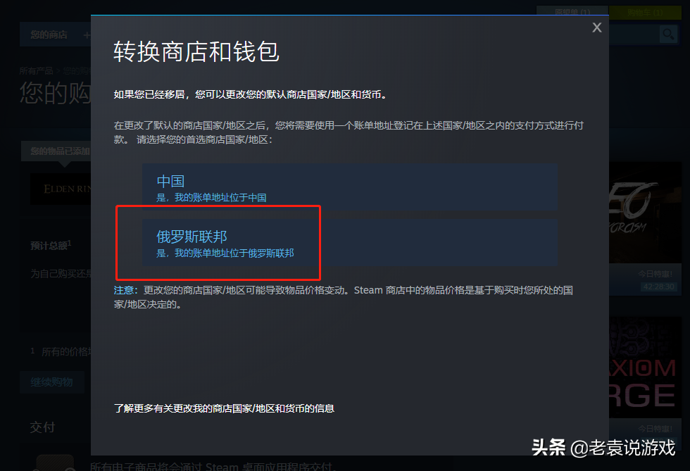 玩家在新彈出來的視窗中,可以看到提示“轉換商店和錢包”,點選選擇“俄羅斯聯邦”。