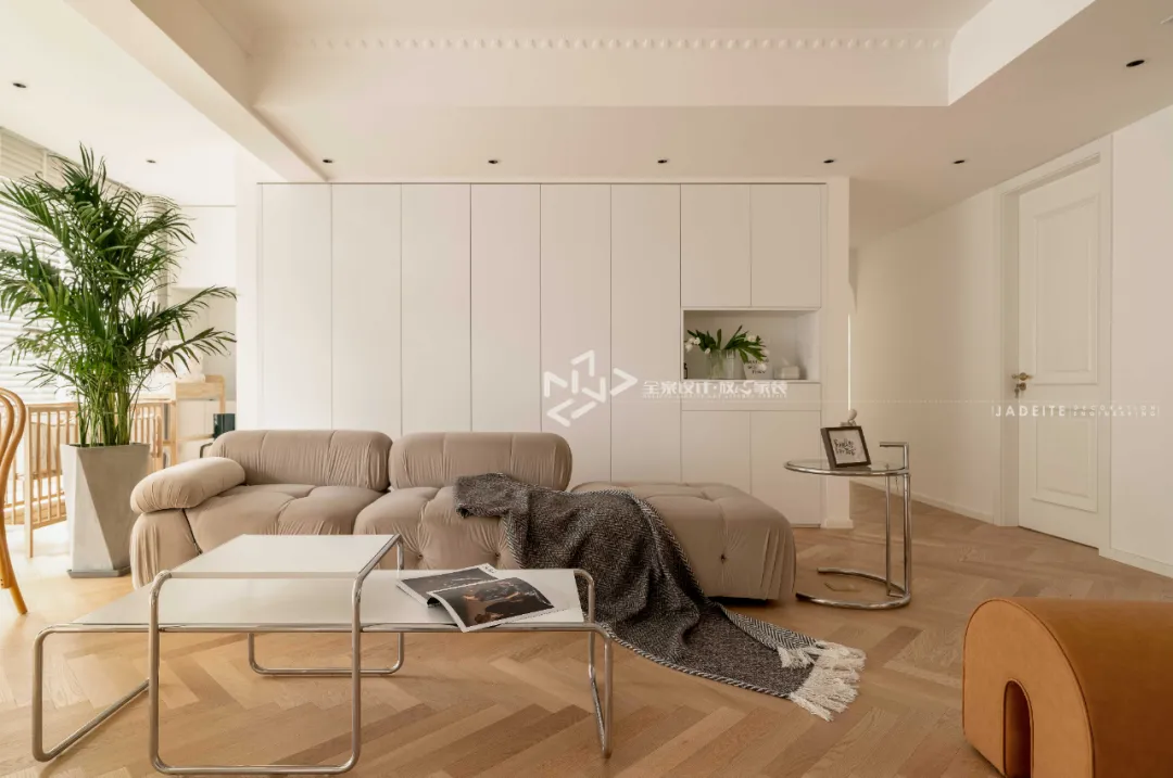 奶油白、雅緻棕、自然木,拉滿客廳獨一無二的氛圍,去除客廳後面的房間,做成衣帽間,把客廳擴大,讓空間整體通透開闊舒服大氣。