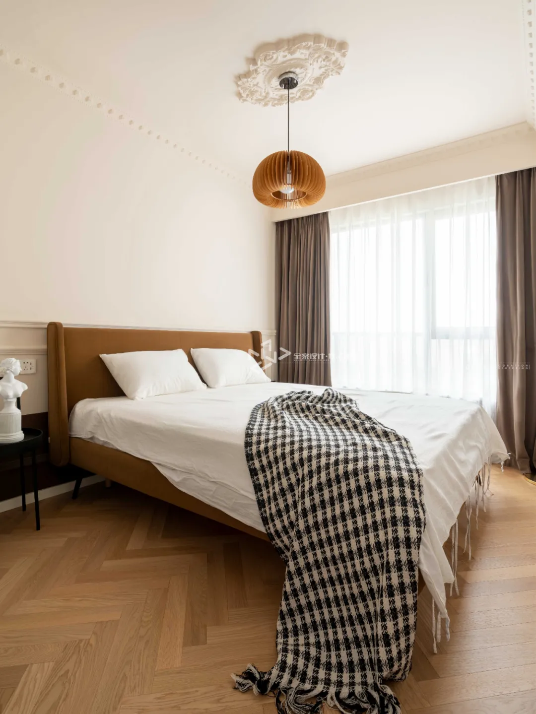 主臥以簡約的白色成就業主的典雅氣質,素雅的白牆與石膏線護牆碰撞,不對稱的床頭置物佈局,充分展現業主內心的個性與不羈,典雅的高腳造型,為睡眠空間增添一絲優雅,也催生一場甜甜的夢。