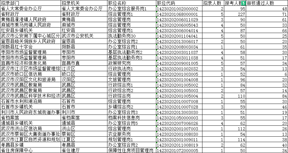 進入湖北省考報名的第2天,湖北省人事考試網釋出官方資料,截止至2022年2月20日16:00點,湖北省公務員考試共報名24158人,透過稽核人數10009人,1259個崗位無人報名。50人以上報名崗位27人,其中最熱門的崗位為省財政廳,綜合管理崗1,招錄5人,報考人數227人。下面小編給大家展示官方的崗位資料。
