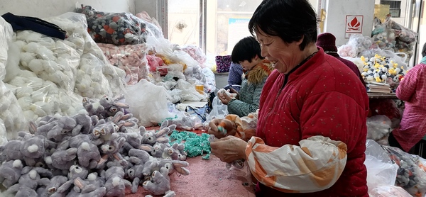 在這個擺滿了各式毛絨玩具的二層農家院,樓上樓下的幾個房間裡,數十名村民正在聚精會神地縫製玩具。