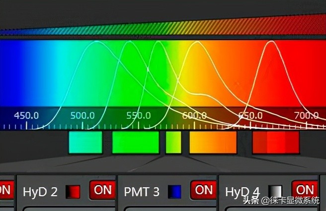 為了拆分多色成像的發射光譜,首先由分束器或色散元件將不同顏色的光引入到不同的方向[1],帶通濾片則能夠最大限度地減少串色,並抑制所有殘留的激發光,最終到達感測器。在過去,常使用的濾片是普通的玻璃帶通濾片。如今,一項革命性的設計誕生了,那就是在多波段元件(探測器)中使用光度計滑塊。該設計可以極為有效地探測發射光,同時提供完全可調諧性,與此同時帶來的好處是使光譜掃描成為了可能。使用白鐳射作為光源時,可調諧光譜檢測器是唯一與可調諧光源光譜自由度匹配的裝置。其他的光譜檢測裝置使用一系列檢測元件,其波段是固定的,但它們不可調諧,靈敏度較低。