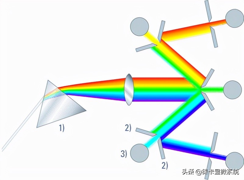 圖2:探測器採用玻璃稜鏡,具有高透射率和分光效能。透過可移動的反射鏡滑塊將光譜分成多個波段。這使得光譜可以分成任何可能的子光譜集,然後被檢測器通道測。。