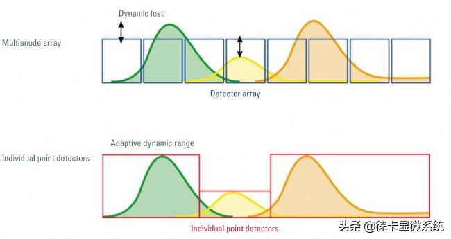 圖3:單點探測器(探測器)可以調整樣品中各種染料發射的動態差異。與多陽極陣列探測器相反,兩個探測視窗都是可調的,並且可以單獨調整動態範圍。