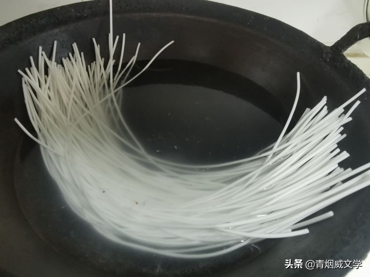 粉條放入鍋內涼水中,開火加熱。待水將沸時關火,蓋上鍋蓋燜,待水涼了,粉條就泡軟了,沒有硬心。