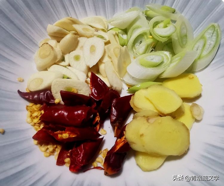 備好姜、蔥、大蒜、幹辣角,切片。