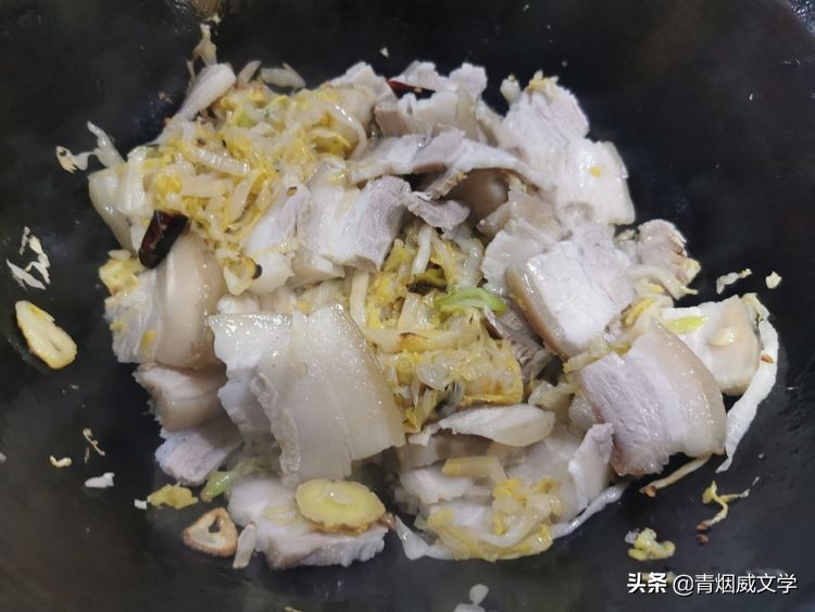也有一種做法是將五花肉切片和小塊後用生抽醃製上色,下油鍋翻炒至熟,再加酸菜一起翻炒。