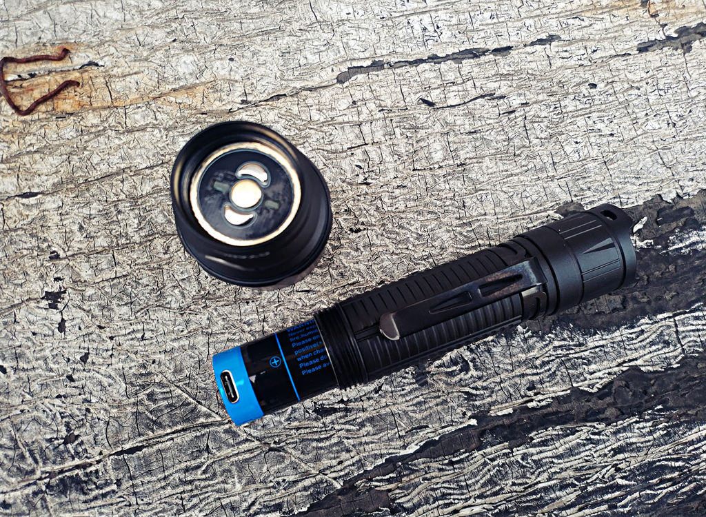 手電主要結構是三部分,筒頭、筒身、尾蓋,擰下筒頭可見具有C口的電池。