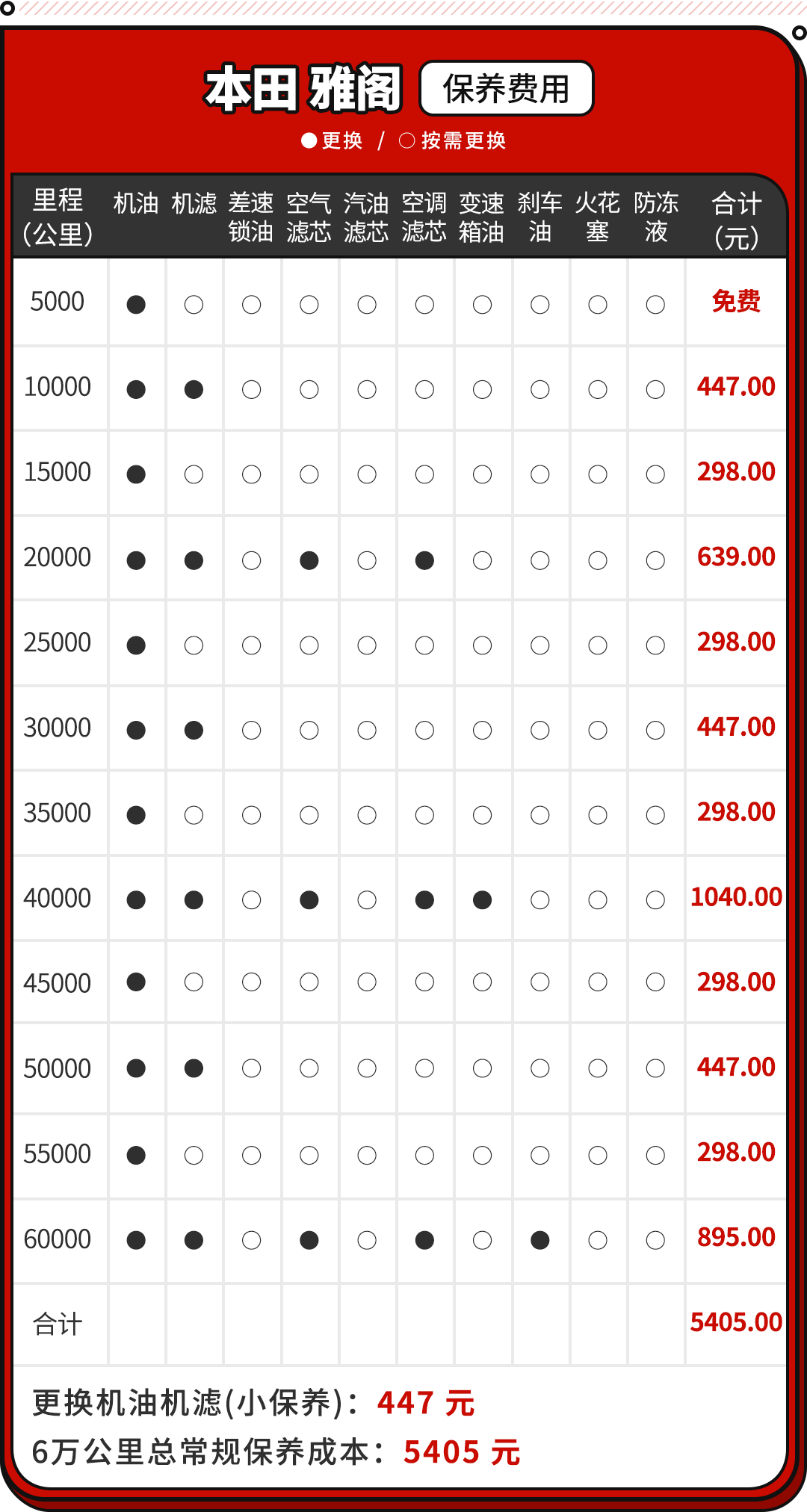 按照常規的3年/6萬公里來算,本田雅閣3年內保養費用總支出為5405元。
