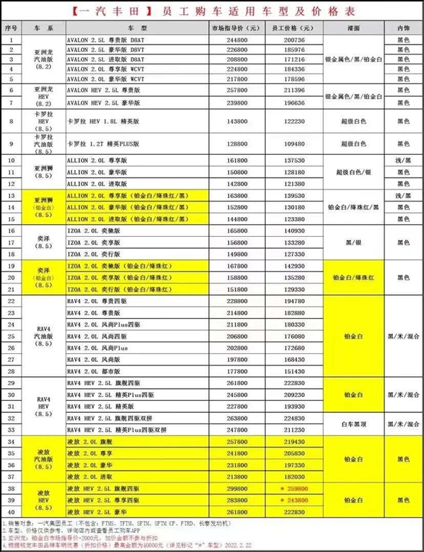日前,車友圈曝出了一份標題為“【一汽豐田】員工購車適用性車型及價格表”,表中包含亞洲龍、卡羅拉、奕澤、榮放、亞洲獅、凌放等在售車型。