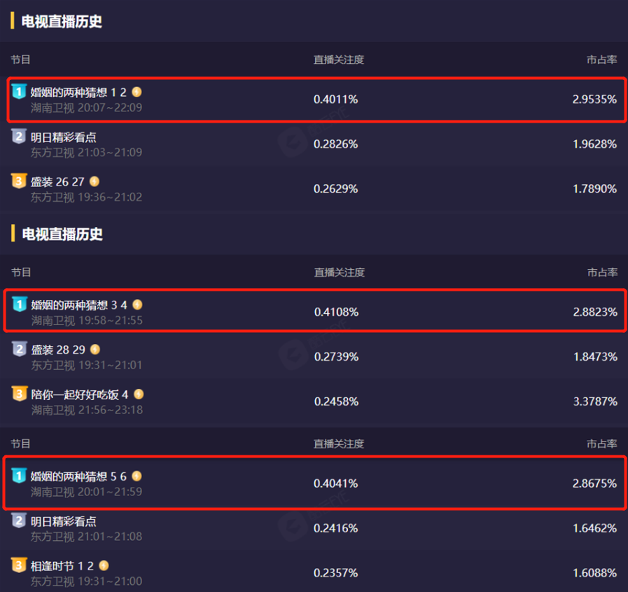 根據資料顯示,電視劇《婚姻的兩種猜想》僅僅上線6集,就已經收視連續拿下衛視第一。照目前的趨勢發展,電視劇在熱度發酵之後很有可能成為掀起現象級熱度的爆款。