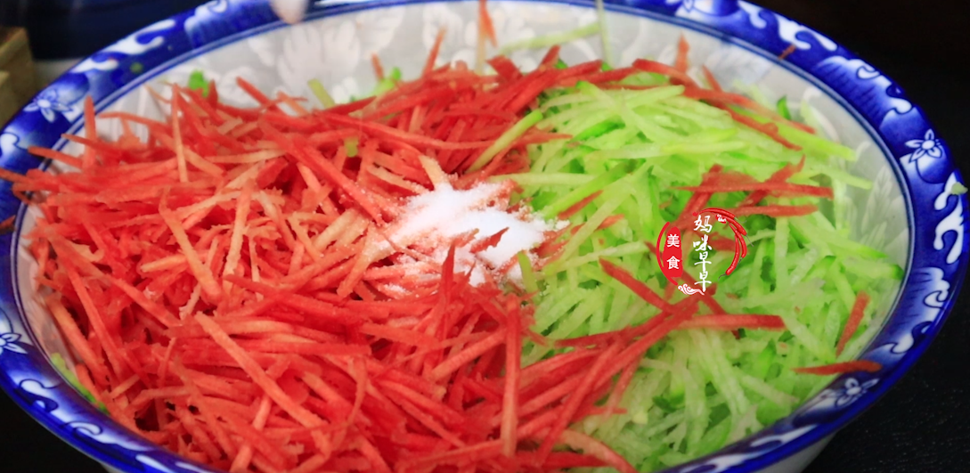 第二步、接著加入2勺鹽,把蘿蔔絲抓拌均勻,醃製10分鐘,沙出多餘的水分。