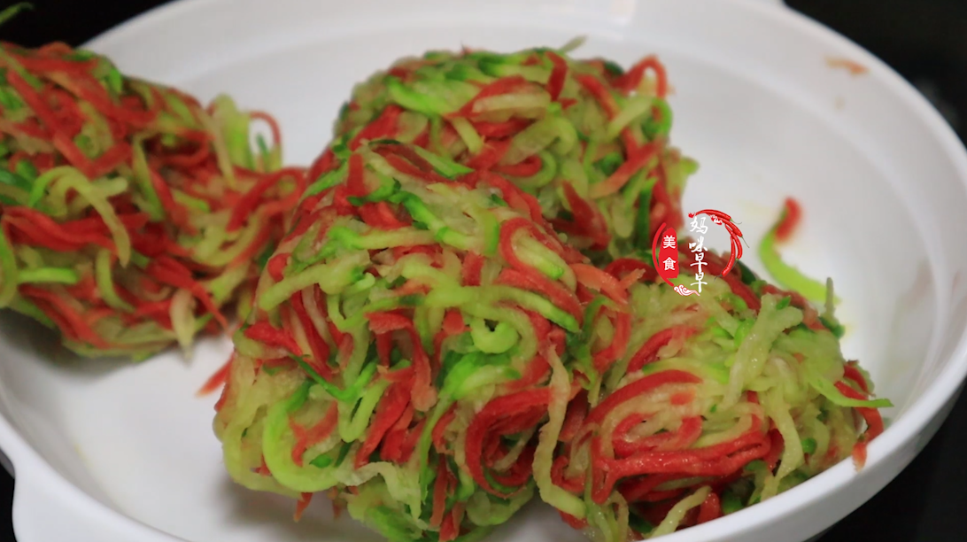 第四步、時間到了後蘿蔔已經沙出很多水分了,我們把蘿蔔擠幹水分,儘量擠的幹一些,這樣炸的時候更脆,也熟的快。