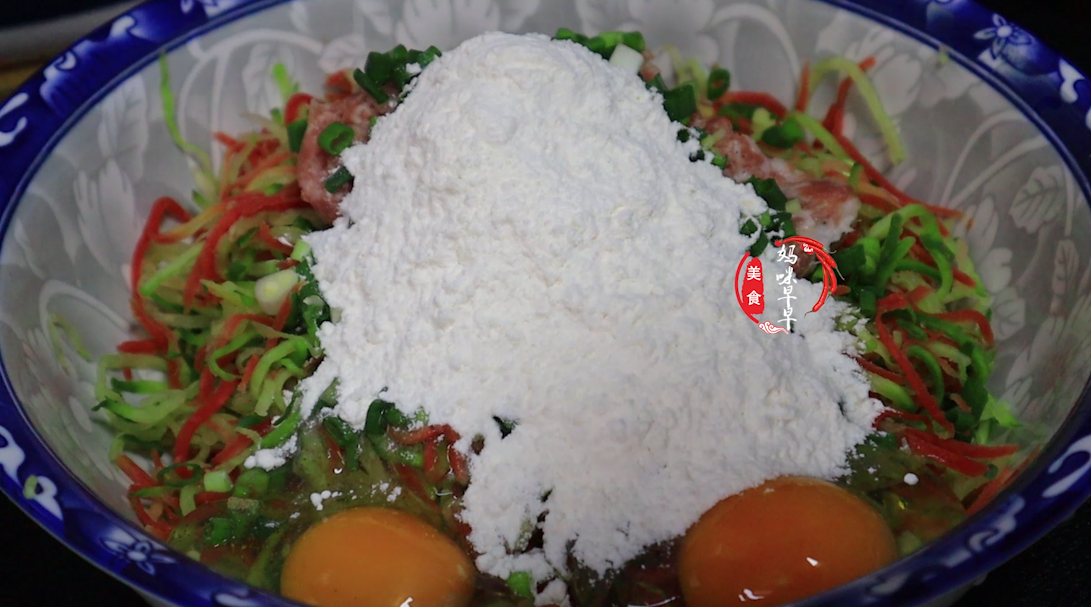 第五步、然後將蘿蔔絲抖散在盆子裡,加入5塊錢的肉沫,蔥花薑末,一勺食鹽、適量胡椒粉,然後打入2個雞蛋,在倒入適量的酥肉粉,這個是酥脆的關鍵。